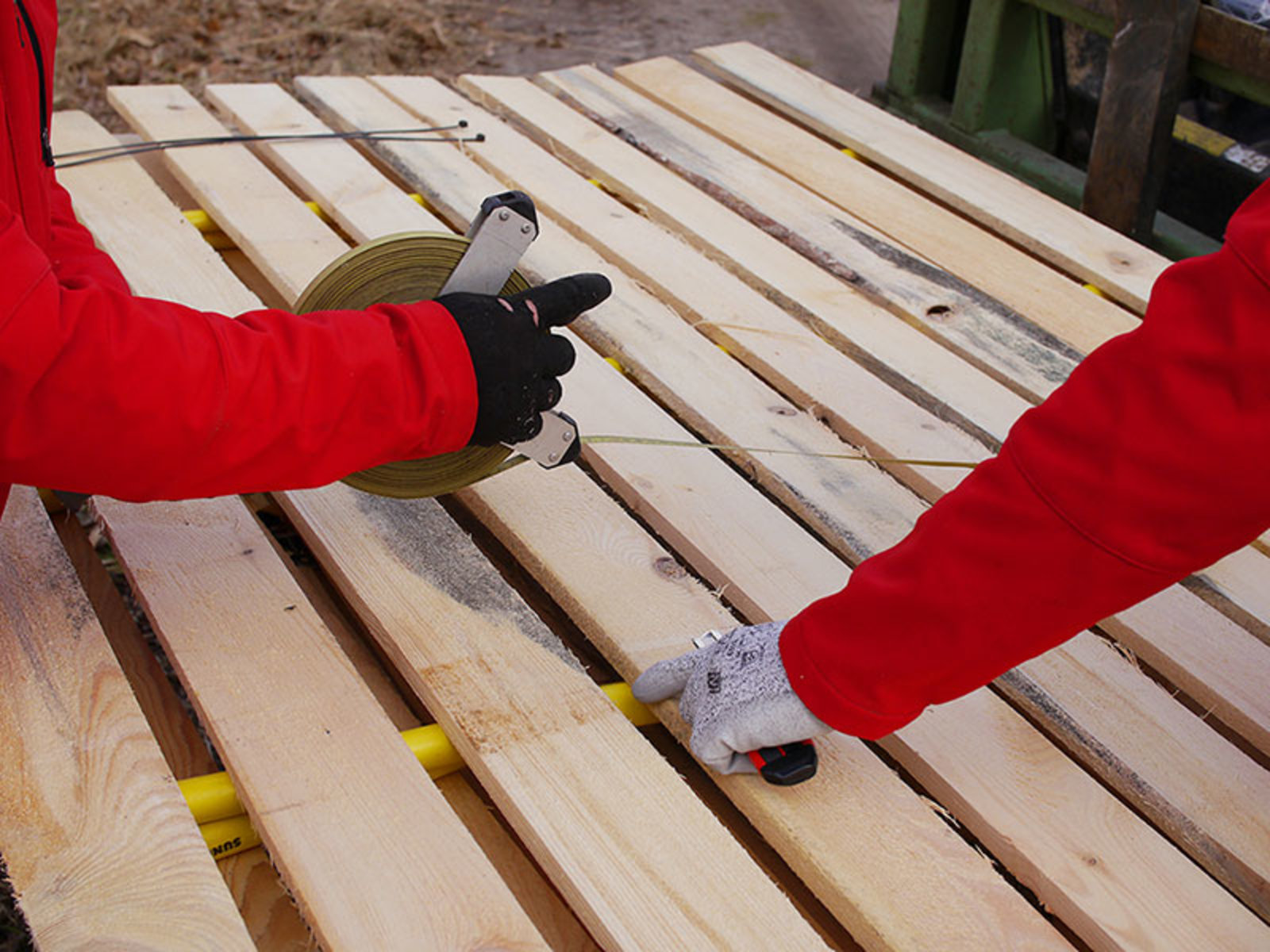 Die Benno-Baumschutzmanschette besteht aus Nadelholzbohlen mit den Abmessungen LxBxT 200cm x12cmx2cm. Diese sind auf 3 flexiblen Trägerschläuchen montiert.
